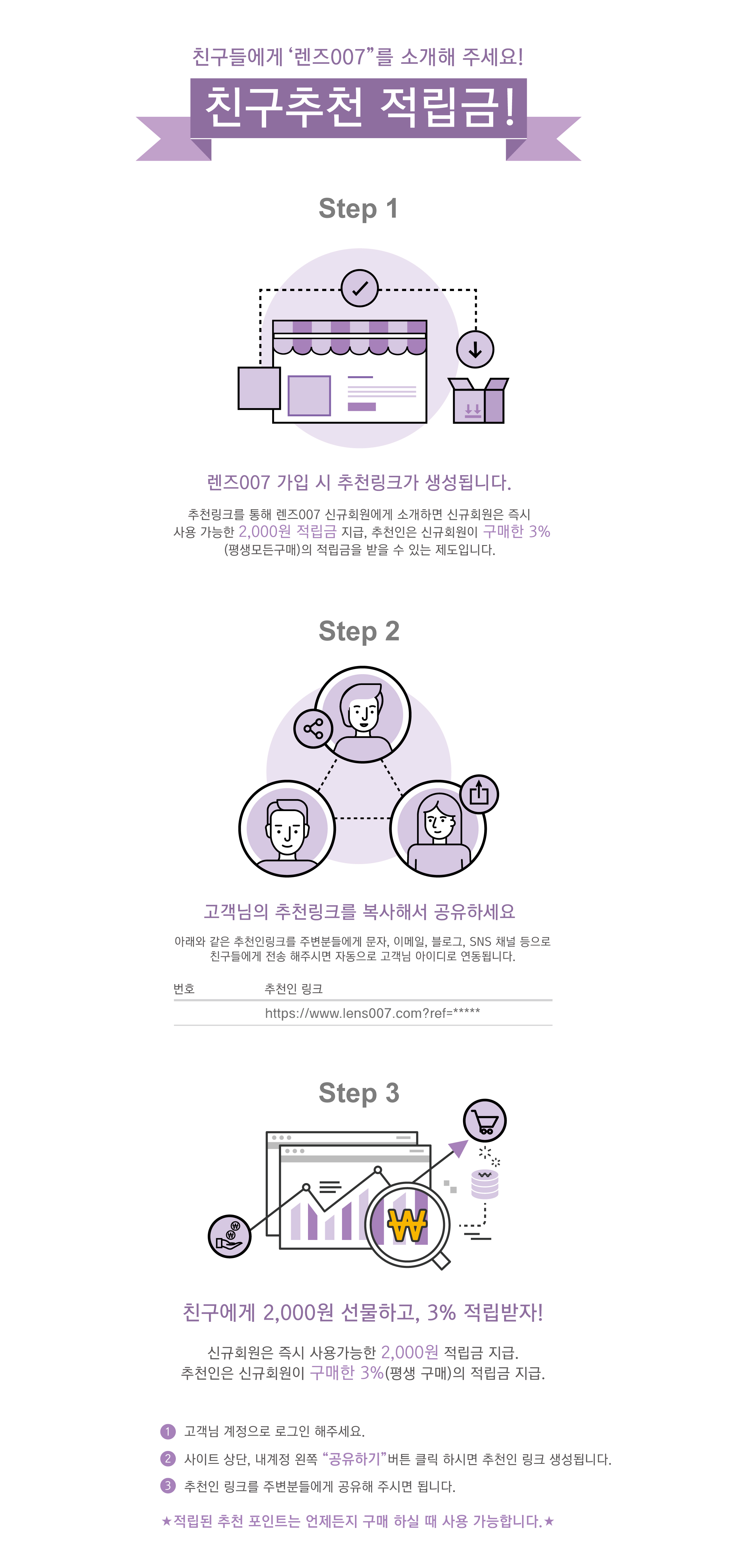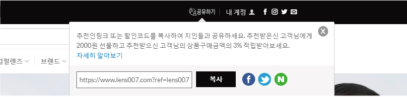 추천 프로그램을 통해 렌즈007 친구추천 혜택을 지인들과 공유하세요.